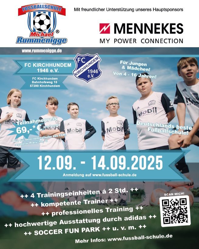vom 12. September bis 14. September wird die Fussballschule Rummenigge wieder zu Gast sein in Kirchhundem. Michael und sein Trainer Team werden wie jedes Jahr wieder viel Spiel und Spass mit den Kids an diesem Wochenende haben. Weiter Infos folgen in den nächsten Wochen.